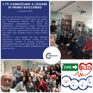 CATANIA – 3 novembre 2025 Presso la sede del Rotary Club Catania Sud si è tenuto un interessantissimo corso BLSD (Basic Life Support and Defibrillation) dedicato alle manovre di rianimazione cardiopolmonare e all’uso del defibrillatore semiautomatico (DAE). All’iniziativa hanno partecipato diverse scuole della città, tra cui l’ITI Cannizzaro, rappresentato dai docenti referenti alla salute, prof. Giuseppe Dicara e prof.ssa Alessia Zimbone.